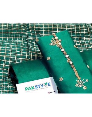 Banarsi Style Embroidered Raw Silk Dress with Organza Check Design Dupatta