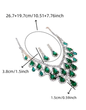 Elegant Green Rhinestone Teardrop Silver Necklace & Earrings Set
