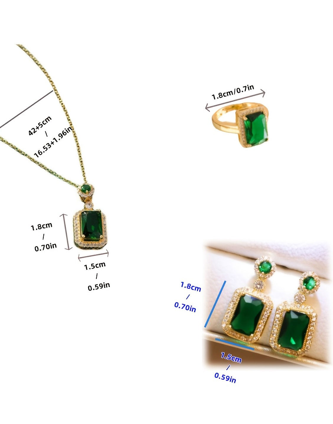 3-Piece Green Rhinestone Necklace Set with Ring & Earrings - Ideal for Daily Wear & Gifting