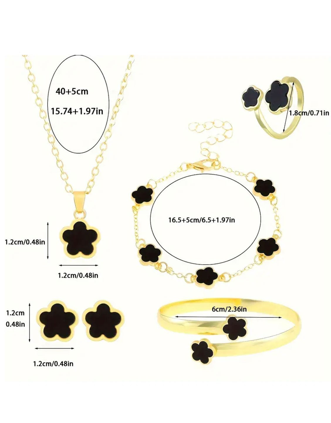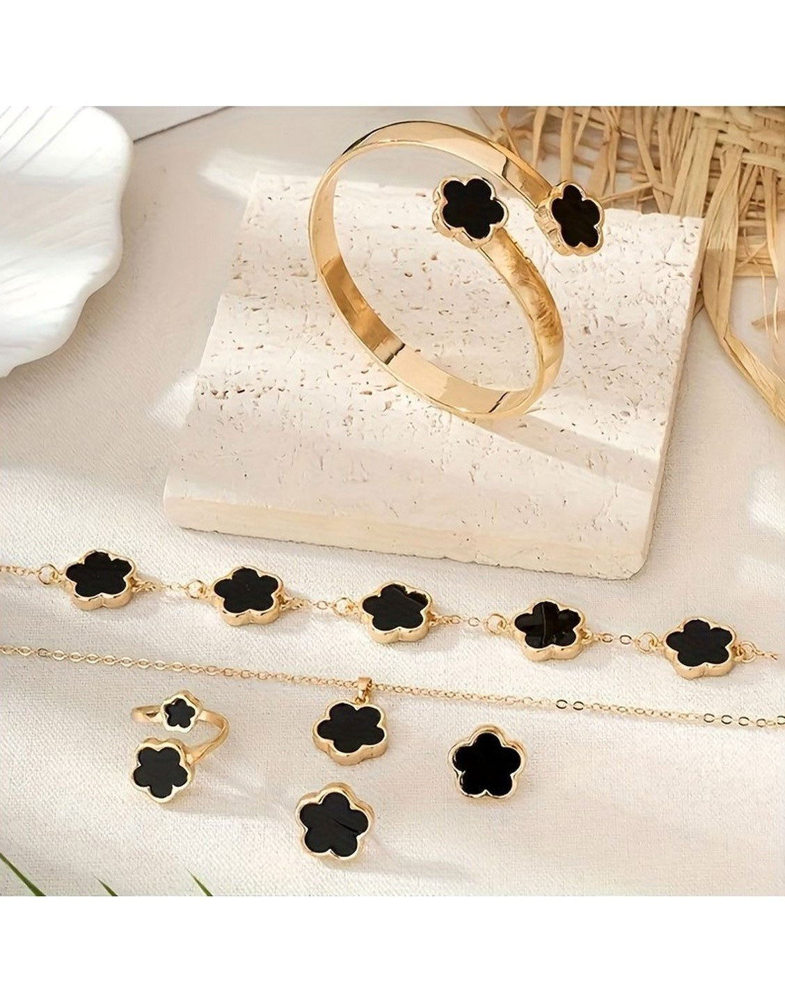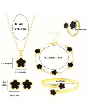 5-Piece Black Five Leaf Clover Design Jewelry Set includes Bracelet, Earrings, Kara, Necklace & Ring