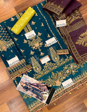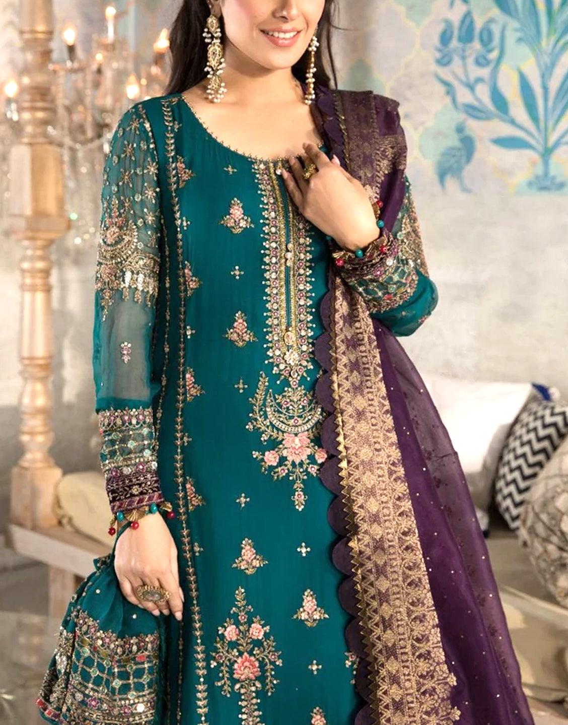 Step into elegance with this Heavy Embroidered Chiffon Party Wear Dress, designed for women who want to make a graceful statement at festive events. Featuring intricate embroidery on premium chiffon fabric, this outfit is perfect for weddings, daawats, and formal gatherings. Whether you are attending a celebration in Lahore's vibrant wedding scene or a stylish evening in Karachi, this zinc green dress offers the ideal blend of tradition and trend. The soft, flowy chiffon ensures comfort, while the detailed embellishments add a luxurious touch.