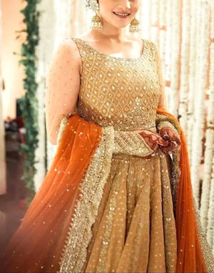 To make the embroidery even more gorgeous, the use of stones, naginas, and mirrors is done around the neckline, as well as the bottom of the maxi. The maxi has kiran work on the daman and is paired with plain crepe trousers. The same kiran work is done on the corner of the vibrant orange colored dupatta as well, which is decorated with jaal style embroidery and sequins. With shimmer style splatter embroidery all over the dupatta, these net maxi suits is expertly crafted.