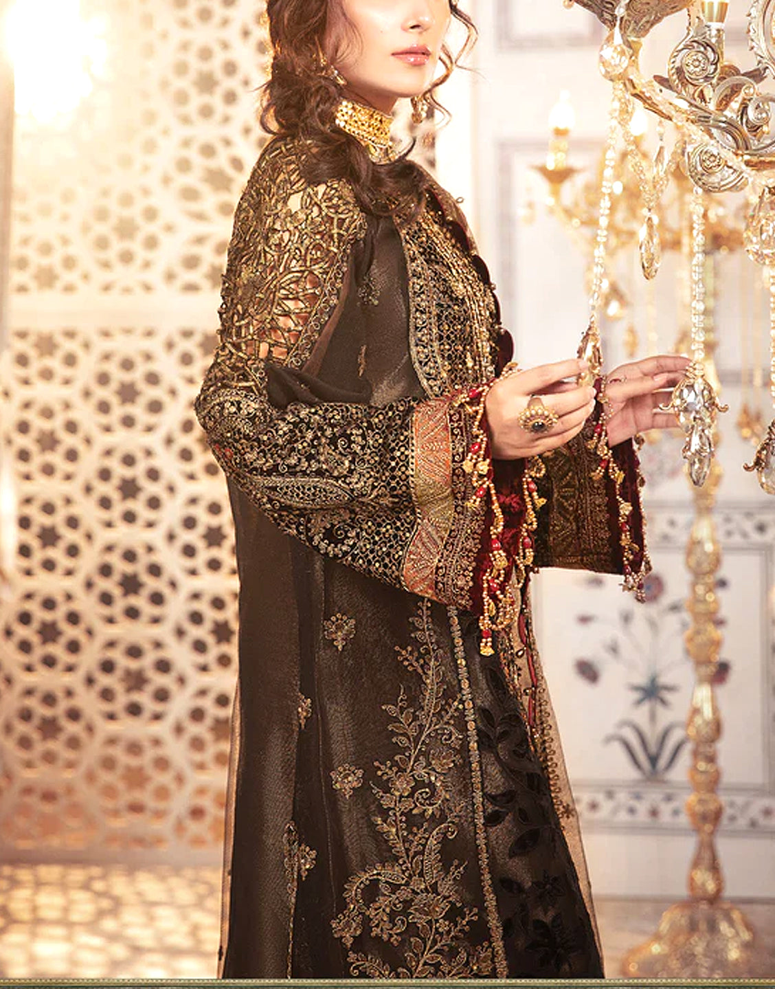 - Heavy Embroidered Organza Sleeves with Hanging Tassels