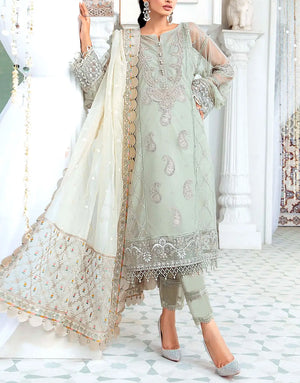 It is in a fabulous combination of pastel green with off-white, where the top and bottom are in the pastel green shade, whereas the dupatta is in an off-white color for a striking contrast. Rich embroidery is done on the shirt in a paisley design, which looks sophisticated. The dupatta also features rich embroidery with a thick embroidered border.