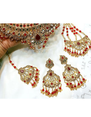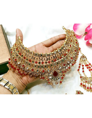 Bridal Collar Choker Necklace Set with Earrings, Jhumar and Maang Teeka