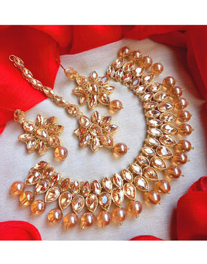 Glamorous Champagne Beads Party Wear Necklace Set with Earrings & Tikka