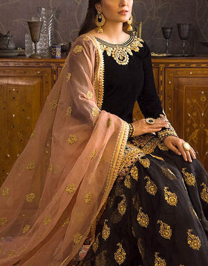 The Pakistani wedding dress is paired with a matching black organza gharara that has zari embroidery on it as well. Along with the gharara, you also get embroidered crepe plain black trousers. As for the dupatta, the suit is paired with a pastel pink organza dupatta. The dupatta also features intricate zari embroidery on it with a four-sided embroidered design.