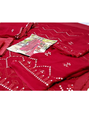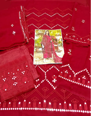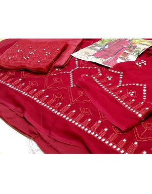 Embroidery is done all over the shirt, where matching lightly done embroidery can also be seen on the chiffon dupatta, which has sequin work as well. As for the bottoms, these chiffon dresses online in Pakistan comes with plain raw silk trousers, which are in a matching tone of red and come with an embroidered patch to be sewn on the hem area of the trousers.