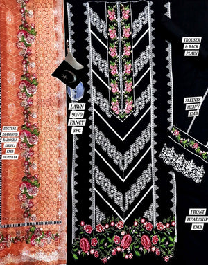 Heavy Embroidered Black Lawn Dress with Emb. Brochia Dupatta