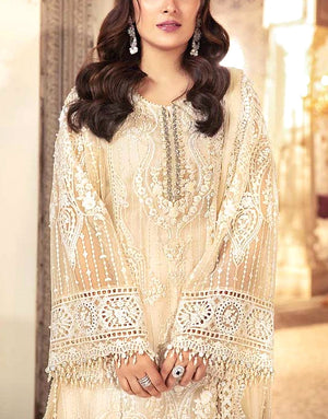 These party wear dresses is ideal for wedding and party wear, where the monochromatic color scheme really adds to the beauty of the ensemble. Having pearl tassels design on the sleeves, hem of the trouser, as well as the daman of the shirt, the suit looks irresistible. With this dress you get plain dyed trousers and a chiffon dupatta with cutwork embroidery on all four borders.