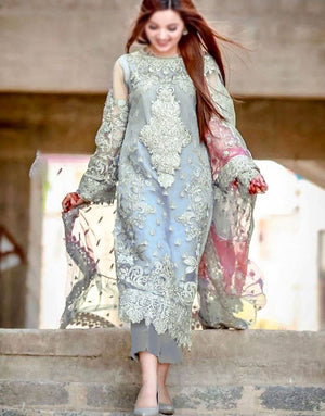 Organza fabric looks very luxurious and Pakistani wedding suits made from organza material are dainty, as well as elegant. This Heavy Embroidered Organza Wedding Dress is a three-piece, unstitched pastel green shaded outfit that has a dupatta, along with a shirt made of organza material, whereas the trousers are of silk fabric. The shirt is heavily embroidered with zari work and displays intricate patterns that are quite regal looking.