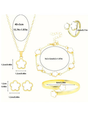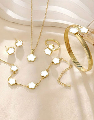 5-Piece White Five Leaf Clover Design Jewelry Set includes Bracelet, Earrings, Kara, Necklace & Ring