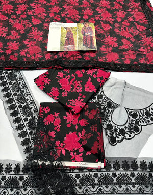Aneela's All-Over Print Black Embroidered EID Lawn Dress with 4-Side Emb. Chiffon Dupatta