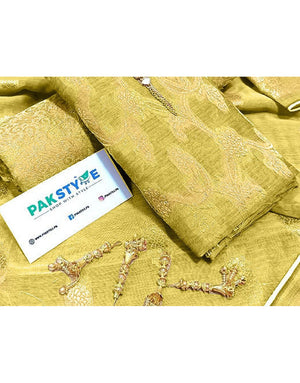 These three-piece unstitched dresses online is in a eye-caching color, which along with the gold-shaded self-print design has a very festive look to it. The complete outfit is designed using cotton jacquard material, which makes it appropriate for year-round wear. For those who like a touch of fancy, but comfortable fabric, this dress is simply ideal. Having a button-style tassel for the neckline, the suit is inclusive of four golden beaded tassels for the edges of the dupatta.