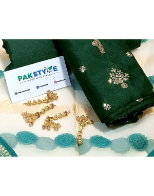 The outfit is in green with a white color combination, where both the shirt and bottoms are in green, whereas the dupatta is in white. Having a self-print on the dupatta, the dupatta comes with four golden beaded tassels that can be stitched on the four corners of the dupatta. Featuring delicate sequin work on the shirt, these silk suits for ladies is also inclusive of a button-style tassel.