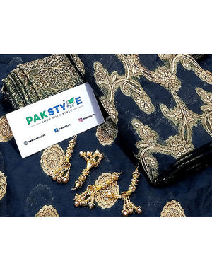 These three-piece unstitched dresses online is in a blue color, which along with the gold-shaded self-print design has a very festive look to it. The complete outfit is designed using cotton jacquard material, which makes it appropriate for year-round wear. For those who like a touch of fancy, but comfortable fabric, this dress is simply ideal. Having a button-style tassel for the neckline, the suit is inclusive of four golden beaded tassels for the edges of the dupatta.