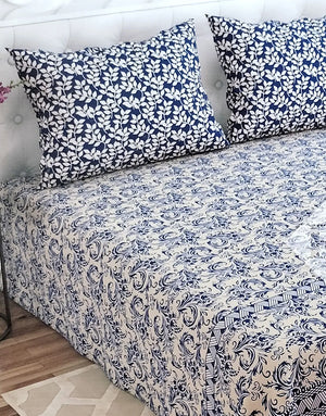 Dynasty 3-Piece Premium Cotton Blue Floral King Size Bedsheet with Pillow Covers