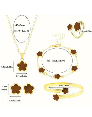 5-Piece Brown Five Leaf Clover Design Jewelry Set includes Bracelet, Earrings, Kara, Necklace & Ring