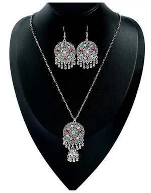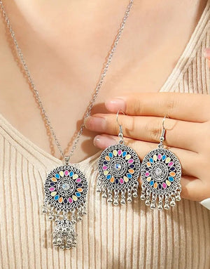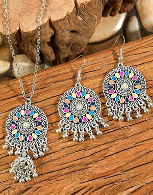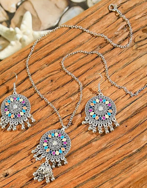 Bohemian Style Silvery Round Women's Jewellery Set with Pendant & Earrings