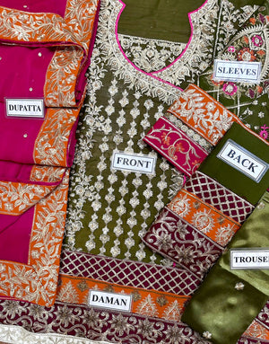 Heavy Embroidered Chiffon Mehndi Outfit with Silk Embroidered Trouser