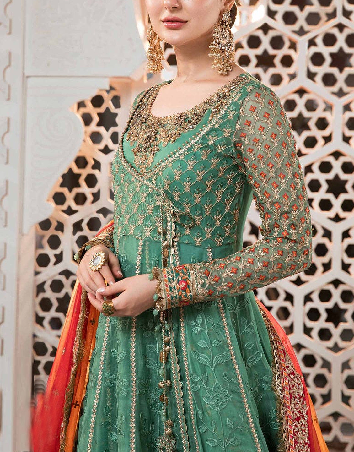 Having a length of 60 inches, these bridal maxi dresses in Pakistan are decorated with detailed zari embroidery in contrasting colors, which looks very eye-catching. With beads and sequins work on the neckline, the sleeves have a lovely jaal style embroidered design with a bail work lace design on the daman of the maxi. The dupatta has a four-sided embroidered design with gota and beaded tassels hanging from the edges. The same tassels can be seen hanging from the daman, which looks very dainty.