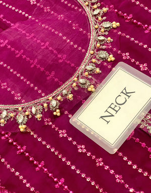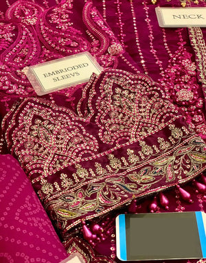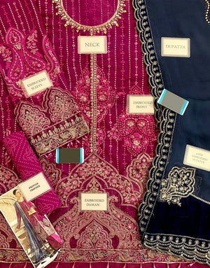 Turn heads this season with our Lavishly Embroidered Magenta Chiffon Wedding Dress, designed for Pakistani women who seek timeless elegance. This unstitched chiffon ensemble blends tradition with luxury, featuring intricate zari, thread, naqshi, and sequins embroidery. From the embroidered neckline and sleeves to the velvet-bordered chiffon dupatta and printed crepe trouser, every detail speaks of bridal finesse. Ideal for summer and winter weddings, this free-size unstitched outfit is your perfect party companion. Shop now and redefine festive glamour.