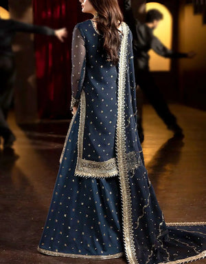 The rich navy blue hue, paired with a flowy embroidered silk sharara and embellished shirt, solves the problem of limited variety in local markets while offering a standout look for Baraat, Walima, or evening events. Whether you are a guest or part of the bride's entourage, this stunning dress ensures you shine with confidence and grace. Order now from PakStyle.pk and enjoy premium fashion without the hassle, delivered anywhere in Pakistan.