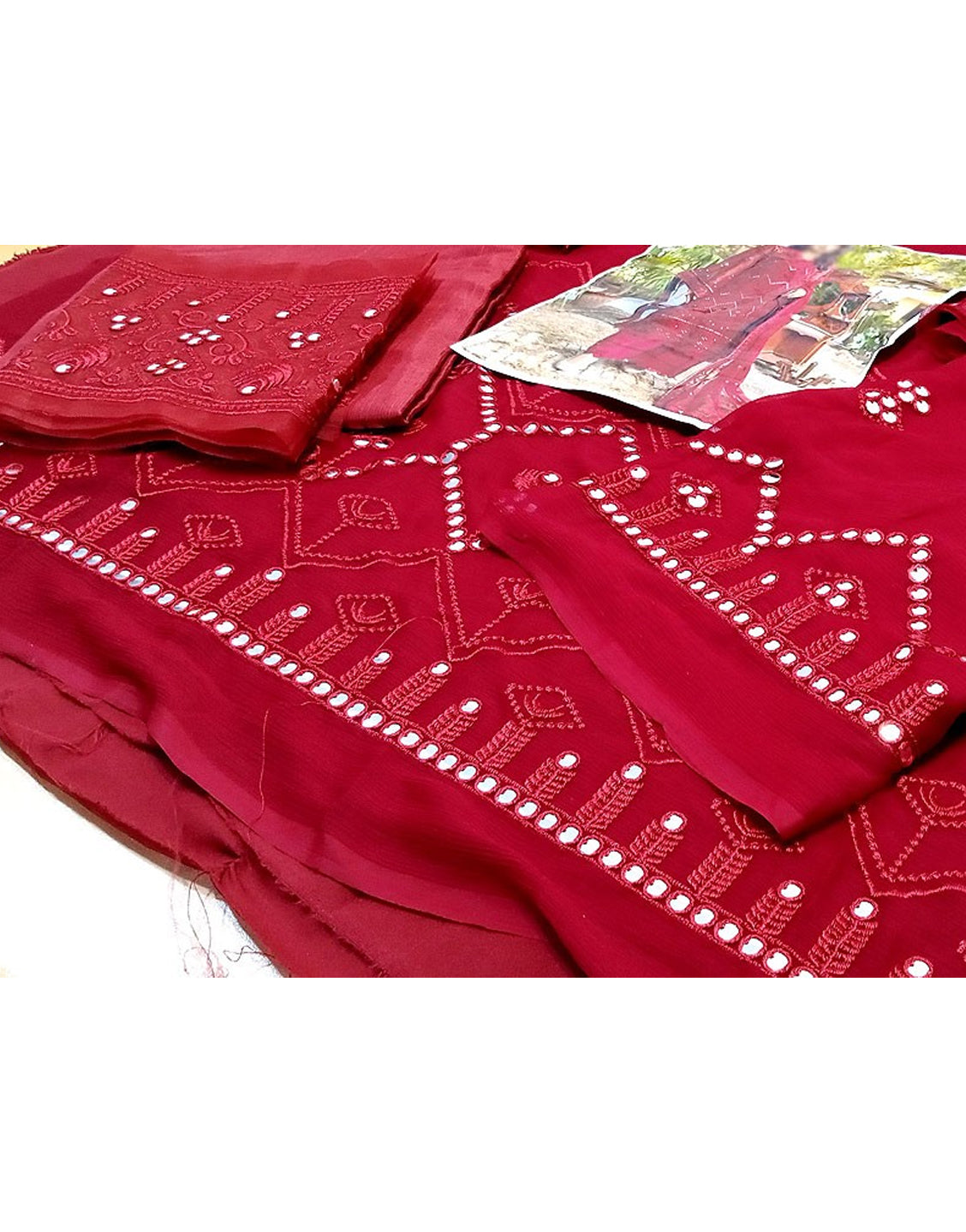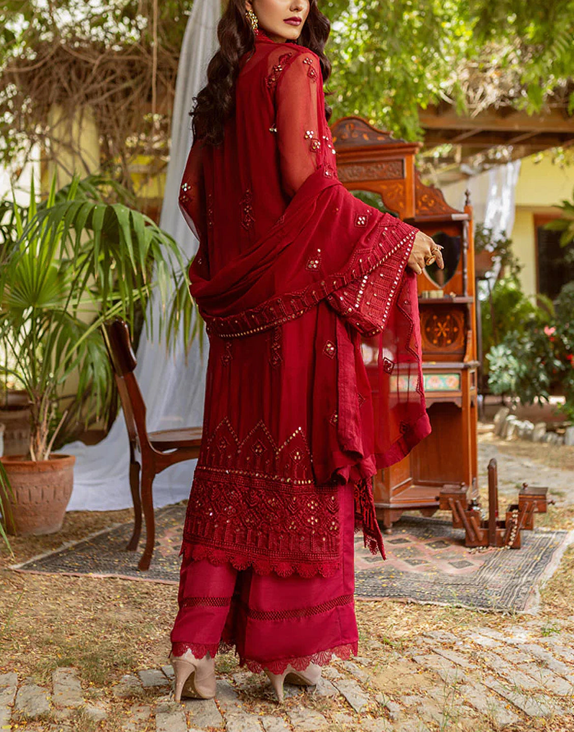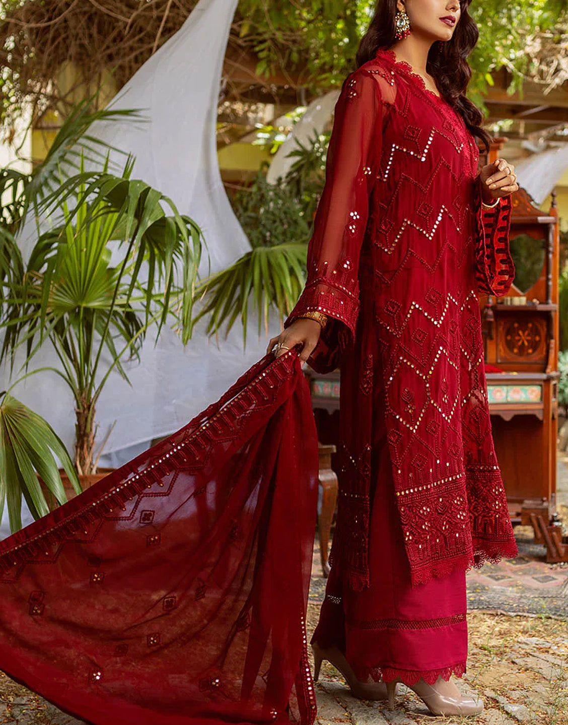 Embroidery is done all over the shirt, where matching lightly done embroidery can also be seen on the chiffon dupatta, which has sequin work as well. As for the bottoms, these chiffon dresses online in Pakistan comes with plain raw silk trousers, which are in a matching tone of red and come with an embroidered patch to be sewn on the hem area of the trousers.