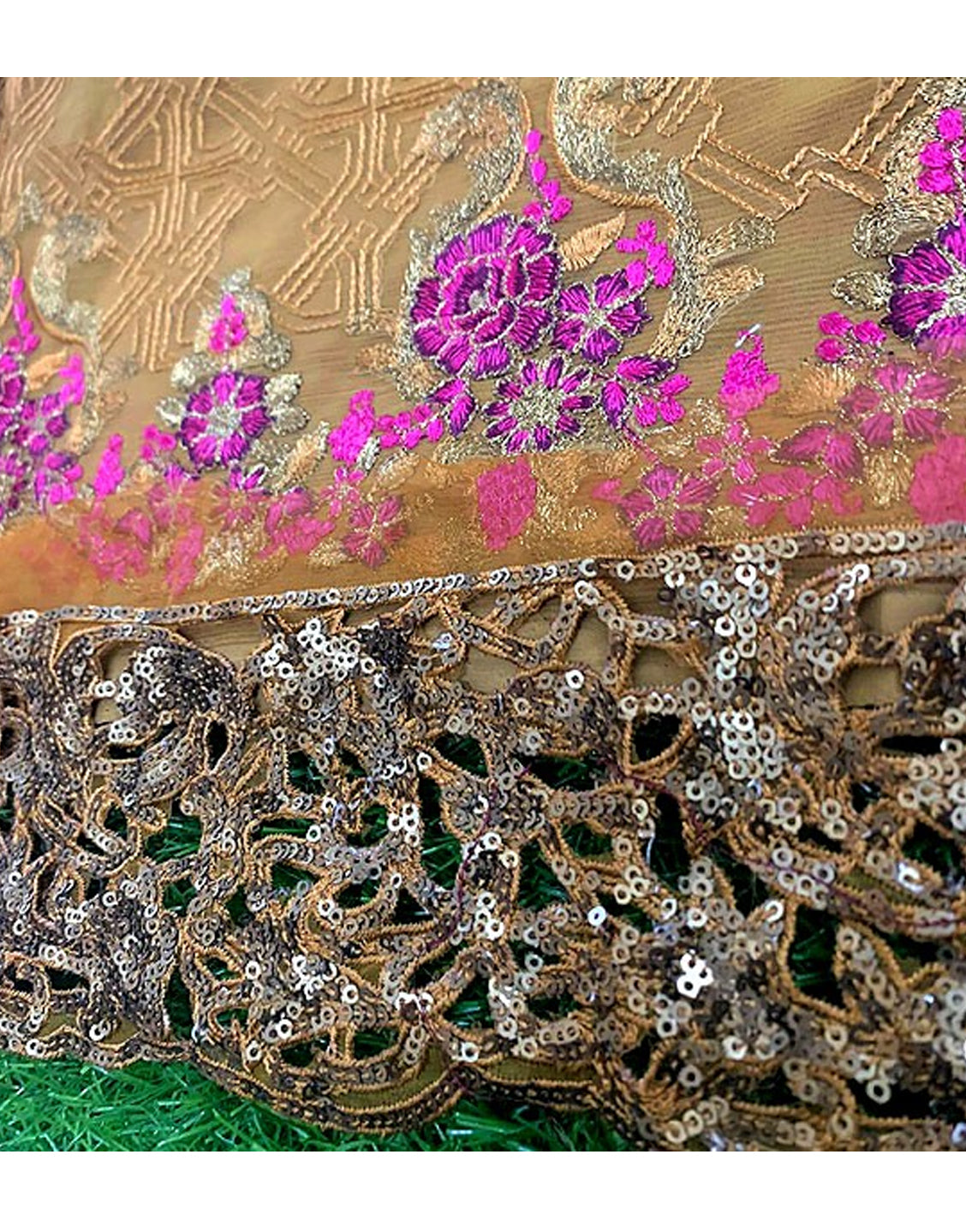 It also features mesh style sequin lace for the daman of the shirt and edges of the sleeves, where you can stitch them for a very dainty look. The dupatta of these wedding dresses for ladies in Pakistan is made of net fabric and it also has embroidery on the edges, which is similar to the work done on the shirt. Having the same mesmerizing floral patterns with sequin fish scales design on the dupatta, the trousers also feature cutwork style embroidery, which is quite appealing.