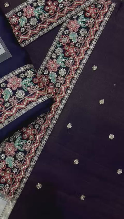 Every Pakistani woman knows the struggle of finding a dress that feels both traditional and stylish, perfect for weddings or festive evenings. This Ethnic Embroidered Navy Blue Chiffon Dress is designed to solve that very problem, offering elegance with ease. Crafted from premium chiffon, the rich navy blue shade exudes sophistication, while intricate embroidery with zari and sequins adds a touch of timeless glamour. The beautifully detailed neckline and embroidered sleeves elevate the look, complemented by a flowing chiffon dupatta with four-side borders that completes the ensemble with grace. Paired with a plain crepe trouser, it ensures comfort without compromising on charm. Whether you’re attending a wedding, reception, or family gathering, this wedding outfit lets you shine with confidence and poise. Don't wait—make this embroidered chiffon dress yours today and step into every occasion with unmatched style and effortless elegance.