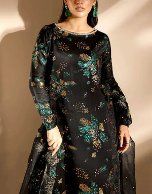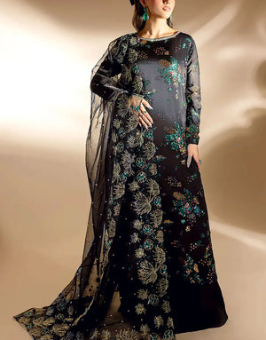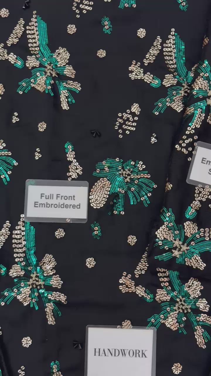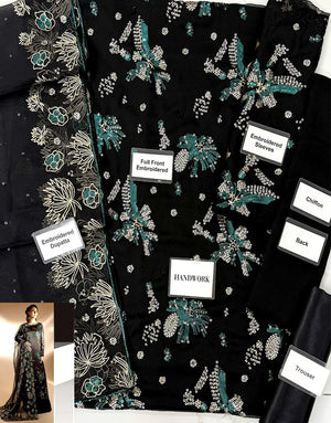 Tired of blending into the background at every mehndi or formal dinner? Finding the perfect black chiffon dress that captures true Pakistani elegance can be a challenge. You need a piece that feels luxurious, traditional, and yet completely unique. Step into the spotlight with our Glamorous Embroidered Black Chiffon Suit. This three-piece masterpiece features a rich, deep black canvas lavishly adorned with vibrant teal and off-white handwork. The heavy thread embroidery and shimmering silver beads catch the light beautifully, making it the ultimate luxury formal wear statement.