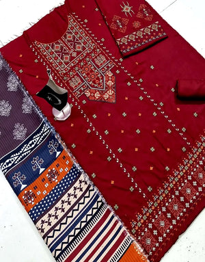 Stay warm and stylish this season with our Sophisticated Embroidered Maroon Dhanak Dress. Crafted from premium Dhanak fabric, this unstitched ensemble blends comfort with elegance-perfect for daily wear or formal gatherings. Featuring intricate thread embroidery on the front, sleeves, and daman, paired with a digital print Kotrai shawl, it solves your winter wardrobe dilemma effortlessly. Complete the look with its plain trouser and embroidered round neck. Make a graceful statement-shop now before it's gone!