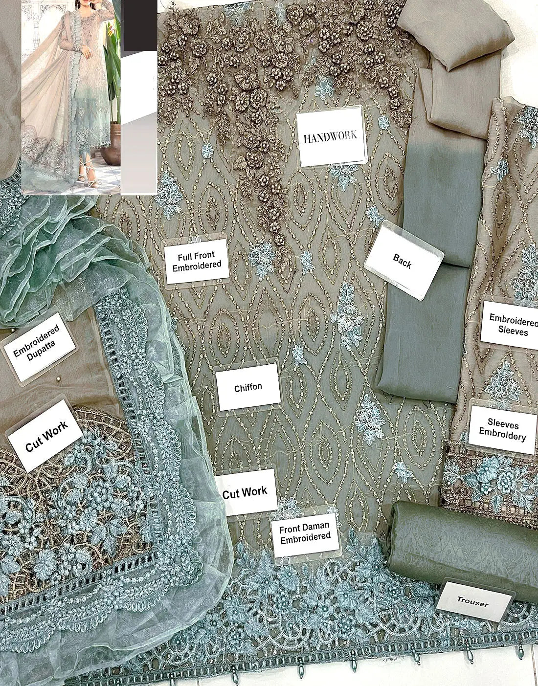 Step into timeless elegance with this Luxury Embroidered Ombre Style Chiffon Party Dress, crafted for Pakistani women who desire both tradition and modern charm. The dusty grayish-green chiffon fabric, adorned with delicate zari and sequins work, solves the struggle of finding a party dress that is graceful yet comfortable. Its hand-embellished neckline, embroidered sleeves, and four-side embroidered chiffon dupatta create a look that radiates sophistication, while the printed jamawar trouser adds a touch of luxury. Perfect for weddings, festive gatherings, or formal parties, this Pakistani wedding outfit ensures you stand out effortlessly. Don't wait—make this stunning ensemble yours today and let your presence shine with unmatched glamour.