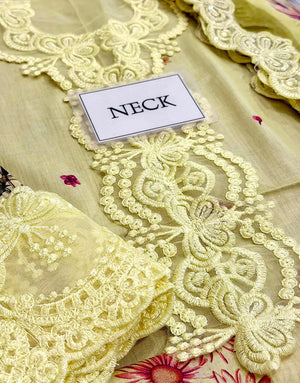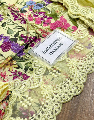 All-Over Print Embroidered Lemon Color EID Lawn Dress with Chiffon Dupatta