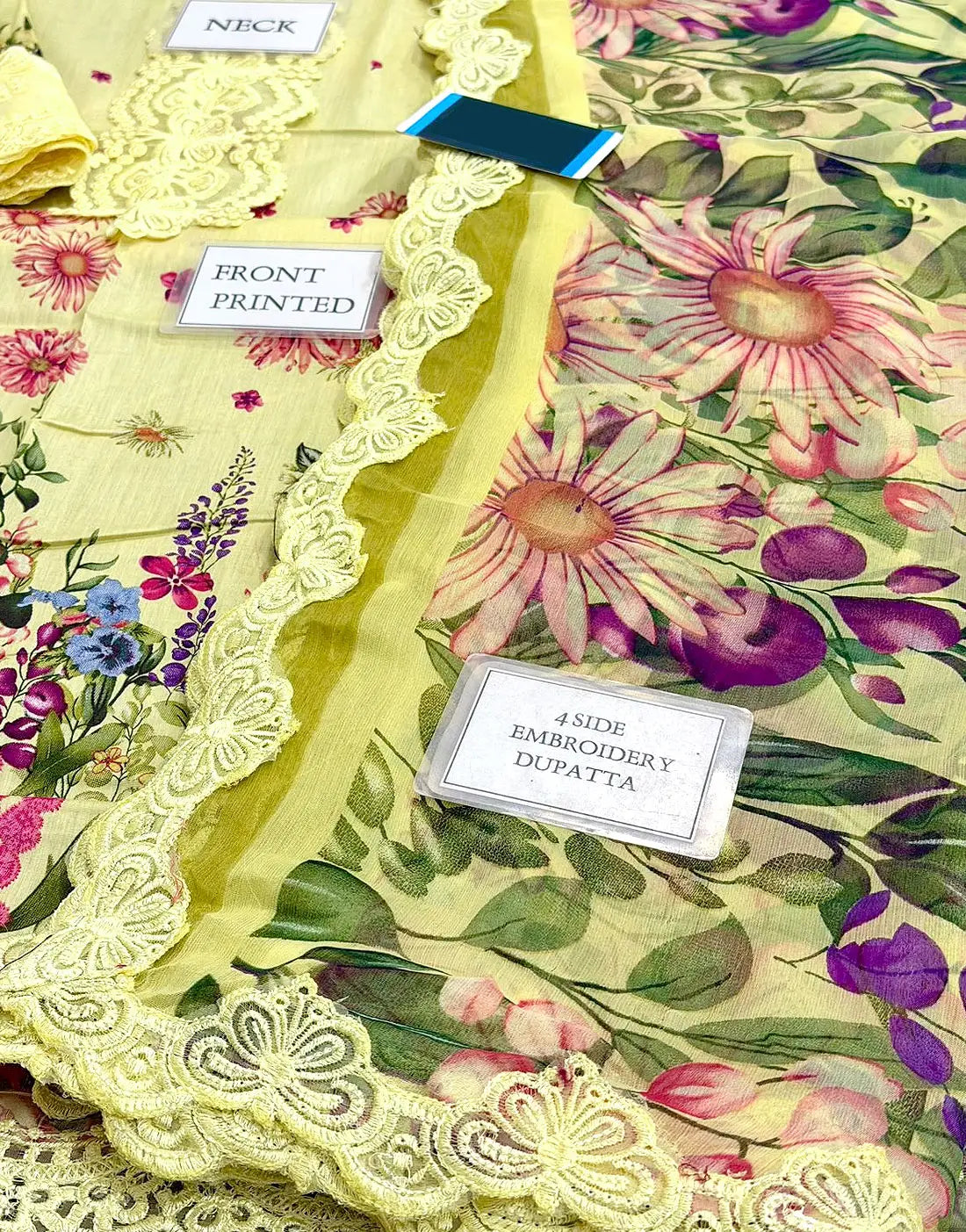 - Dupatta: 4-Side Embroidered Border Printed Chiffon Dupatta