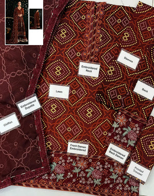 All-Over Chunri Print Embroidered Lawn Dress with 4-Side Emb. Chiffon Dupatta