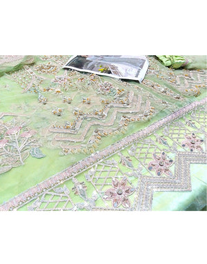 Besides the mirror work and the intricate zari embroidery, elements like sequins, pearls, as well as stones are used for the adornment of this lovely maxi dresses in Pakistan. Its minty green color is very pretty, and the silvery and light gold tinted work on the suit makes it stand out even more. Having a ruffled silk border on the dupatta, the dress is extravagantly crafted and looks very grand.