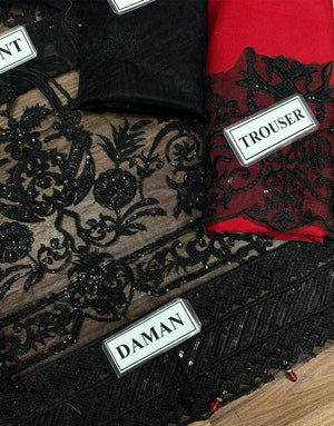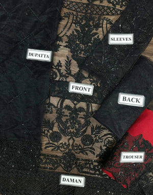 With a red malai inner included, this dress gets its lovely red and black color combination, which is completed with matching red crepe trousers. Having an embroidered back with an embroidered motif daman, the sleeves of these net dresses in Pakistan are heavily embroidered as well. The black dupatta is of the same net fabric and is covered with heavy embroidery on the edges, which is similar to the work done on the shirt.