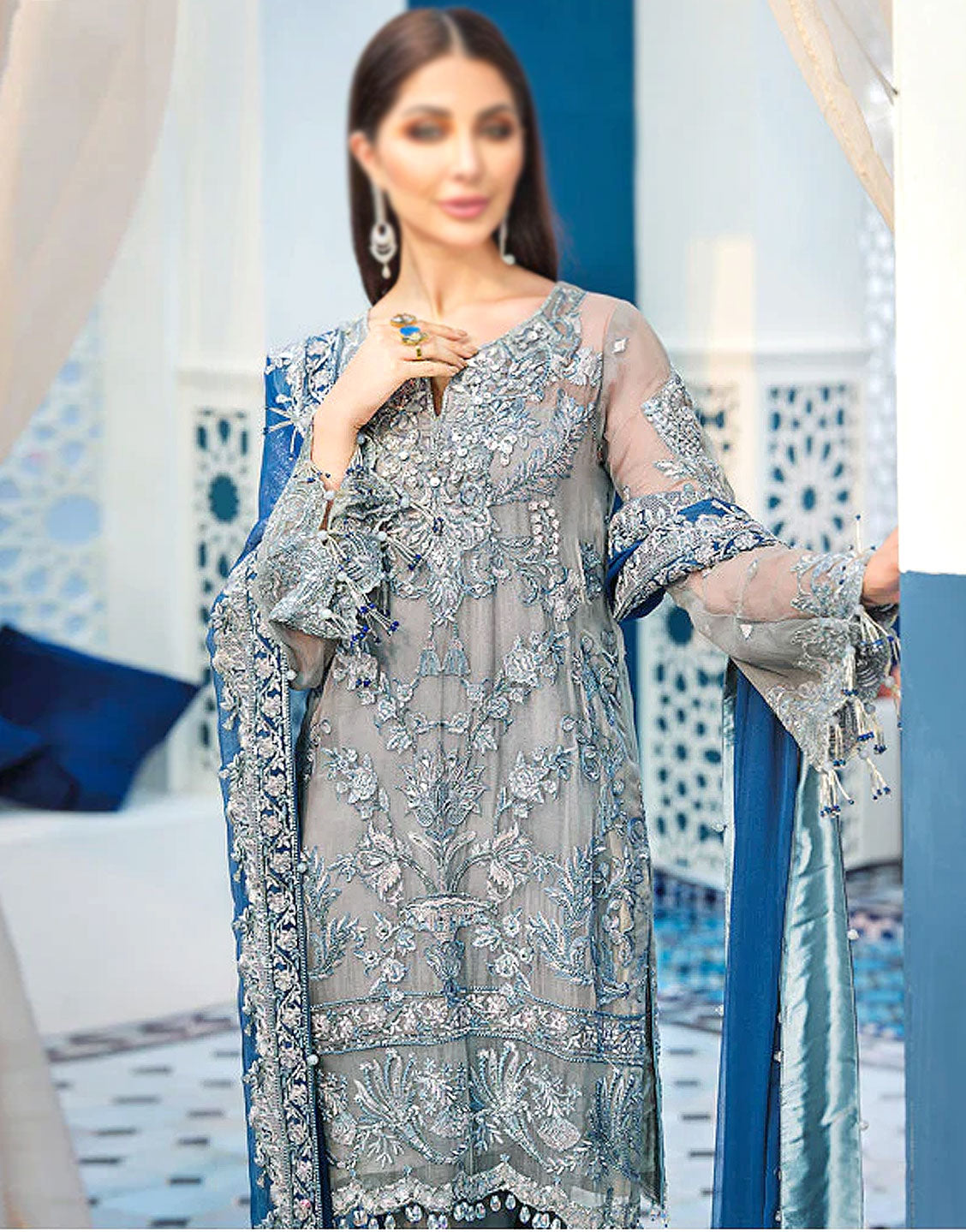 The net shirt is covered with rich thread and zari embroidery in attractive patterns. Grey, silver, and blue toned threads are used for crafting pretty patterns. Sequins, beads, and tassels are used to decorate these wedding dresses, which make it look very alluring. As for the dupatta, the dupatta is made from net fabric and has embroidery on the edges. Thread style tassels are also present on the borders of the dupatta giving the suit a stylish look.