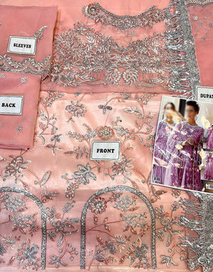 White and pink tinted threads are used for crafting the detailed embroidery patterns on the shirt, whereas the dupatta also has light embroidery with heavy lace stitched on two sides. The real attraction of these organza dresses in Pakistan is the 3D embellishments, where sequins, pearls, and stones are used for the decoration of this outfit.