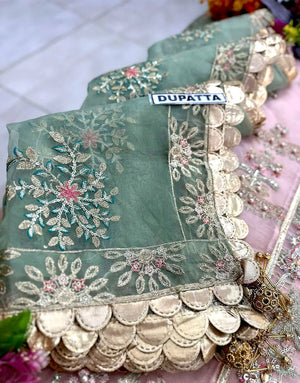 Luxe Embroidered & Handcrafted Neck Blush Pink Organza Dress with Mint Green Net Dupatta