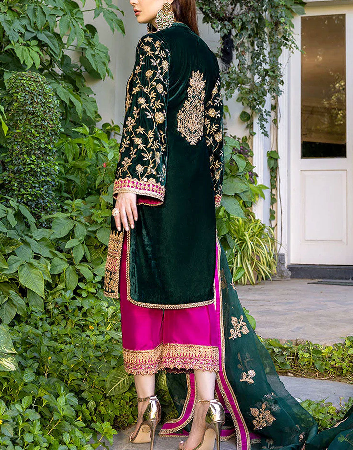 Luxury Embroidered Green Velvet Dress with Emb. Organza Dupatta
