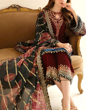 Home Collections Sold Outs Formal Embroidered Maroon Velvet Dress with Emb. Organza Dupatta