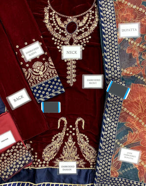 Formal Embroidered Maroon Velvet Dress  with Emb. Organza Dupatta