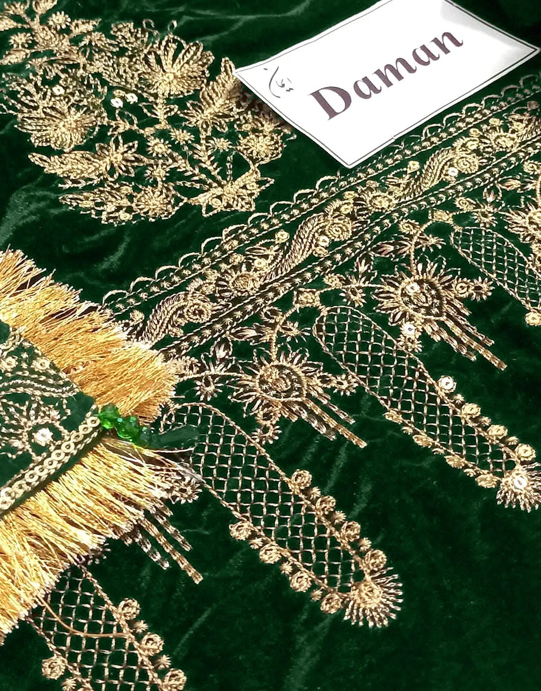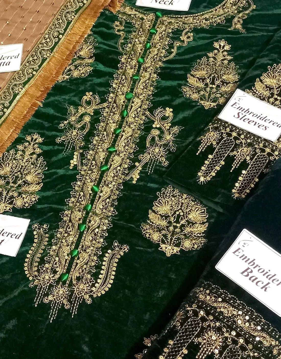 Royal Heavy Embroidered Bottle Green Velvet Dress for Party Wear & Weddings