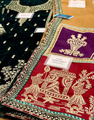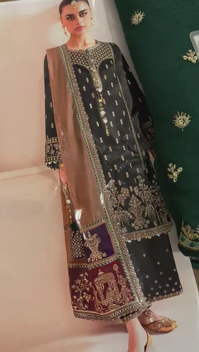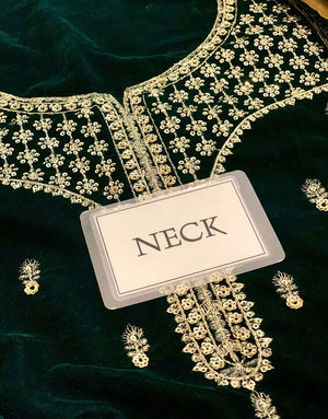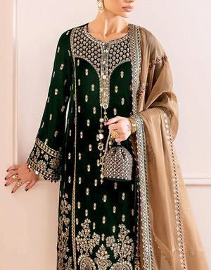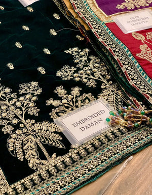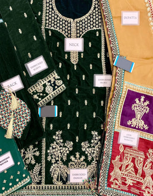 Make a bold statement this season with our Luxe Embroidered Bottle Green Velvet Dress for Wedding & Party. Crafted for Pakistani women who crave elegance, this unstitched ensemble features rich velvet adorned with intricate zari, thread, and sequins embroidery. From its heavily embroidered neck and sleeves to the 4-side bordered organza dupatta and raw silk trouser, every detail exudes luxury. Perfect for spring and winter weddings, this Velvet Collection piece is your go-to for timeless glamour. Order now and elevate your festive wardrobe.