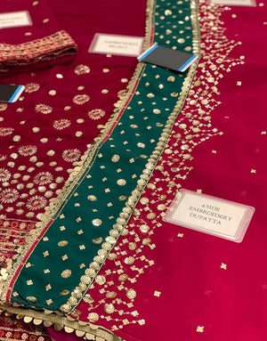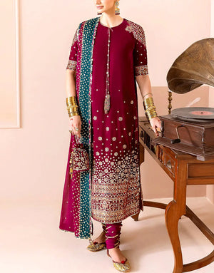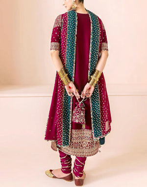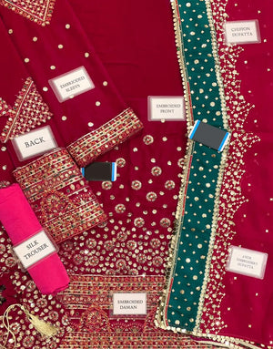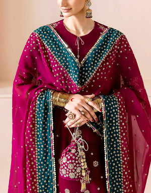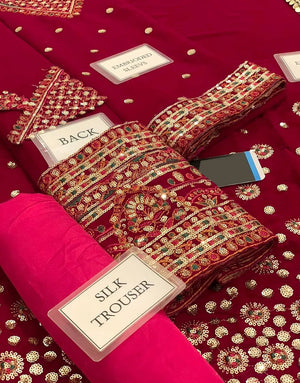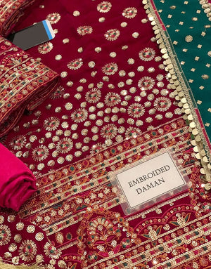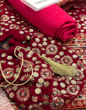 Make a bold statement this season with our Luxe Embroidered Ruby Pink Velvet Party Dress, designed for Mehndi and Bridal wear. This unstitched velvet outfit features rich zari, thread, and sequins embroidery on the front, sleeves, and daman, paired with a plain round neck and velvet back for balance. The embroidered chiffon dupatta with 4-side borders adds elegance, while the satin silk trouser completes the look. A matching velvet spangle potli bag is included for added charm. Perfect for winter and spring weddings, this dress blends tradition with luxury. Shop now and elevate your festive wardrobe with timeless grace.