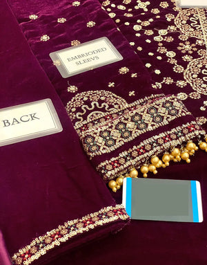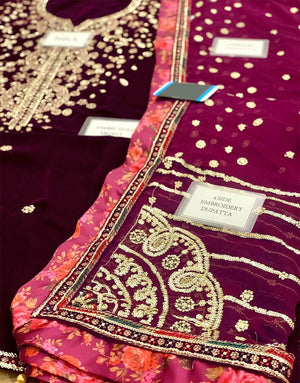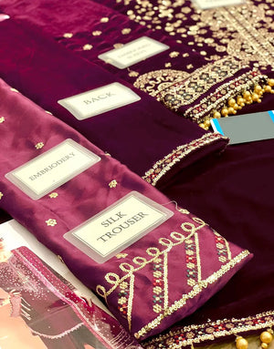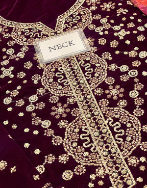 Step into timeless elegance with this Premium Heavy Embroidered Dark Magenta Velvet Wedding Dress, a masterpiece designed for regal celebrations. Crafted from rich velvet fabric, this unstitched outfit features exquisite zari, thread, and sequins embroidery work that adds a luxurious shine. The embroidered round neck, velvet embroidered front, and embroidered daman border with tassels create a perfect royal silhouette. Paired with embroidered sleeves with patches, a plain velvet back, and a 4-side border embroidered chiffon dupatta, it exudes pure sophistication. Completed with an embroidered satin silk trouser, this stunning attire is ideal for bridal, party, and wedding occasions in spring and winter seasons.