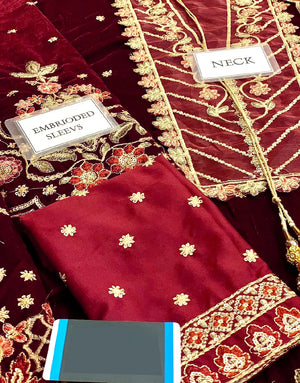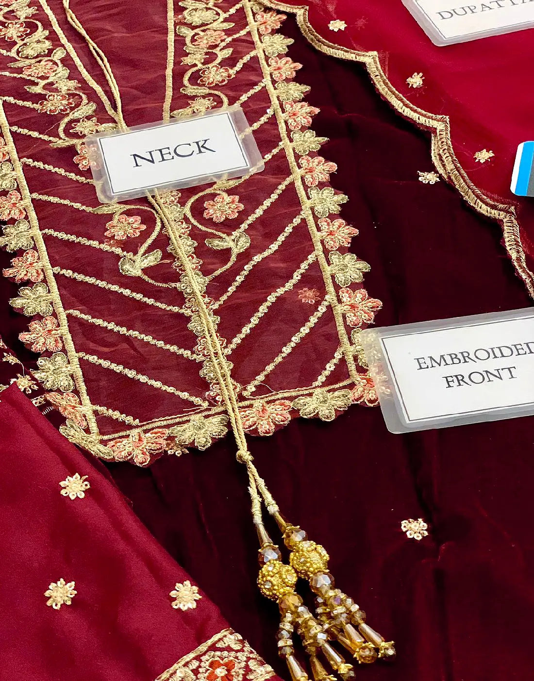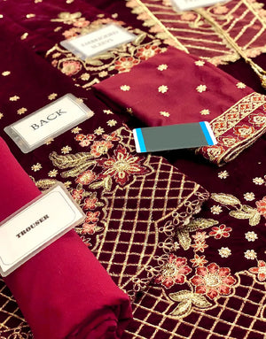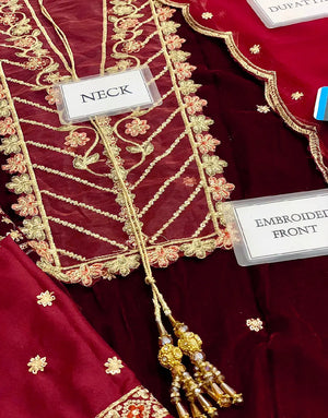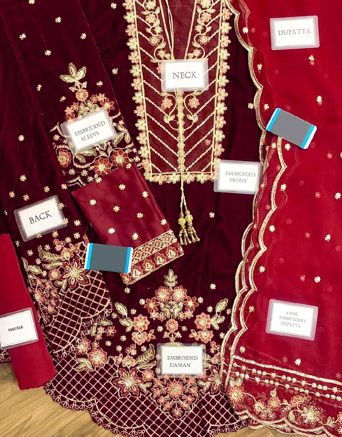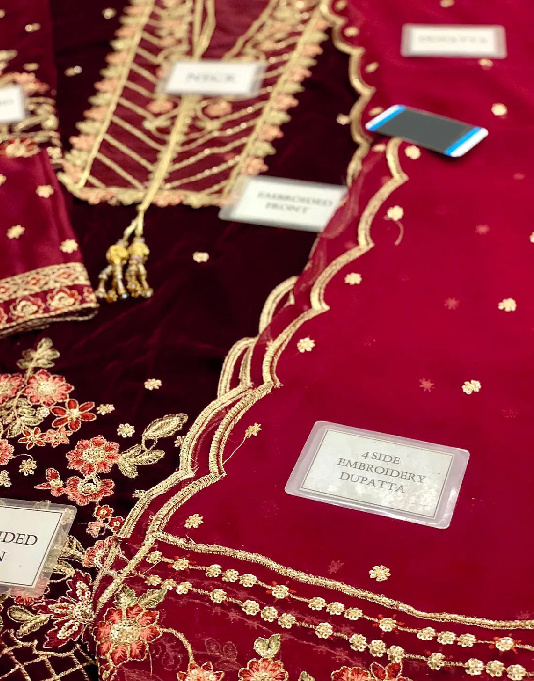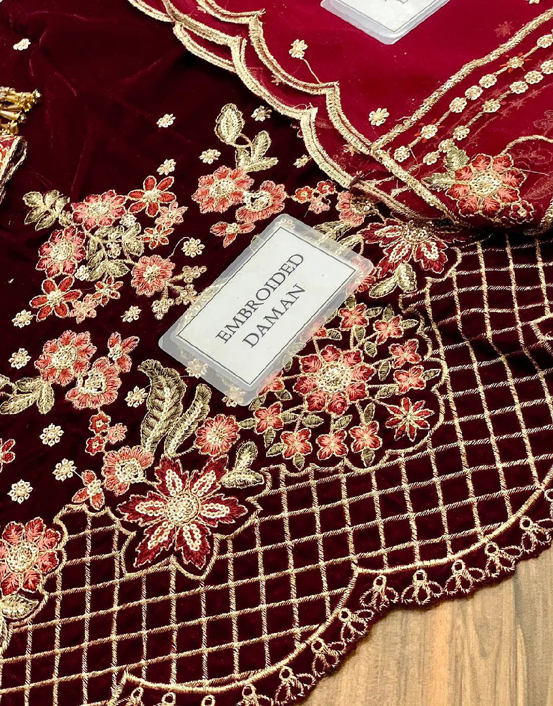 Looking to buy Luxury Embroidered Maroon Velvet Wedding Dress with Heavy Daman Cutwork online in Pakistan? Discover modern designs, reliable quality, and the best price available. Shop now and enjoy fast delivery and secure checkout.