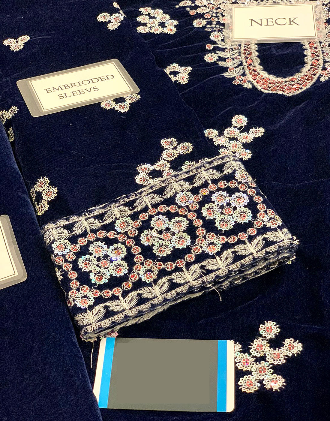 - Sleeves: Embroidered Velvet Sleeves